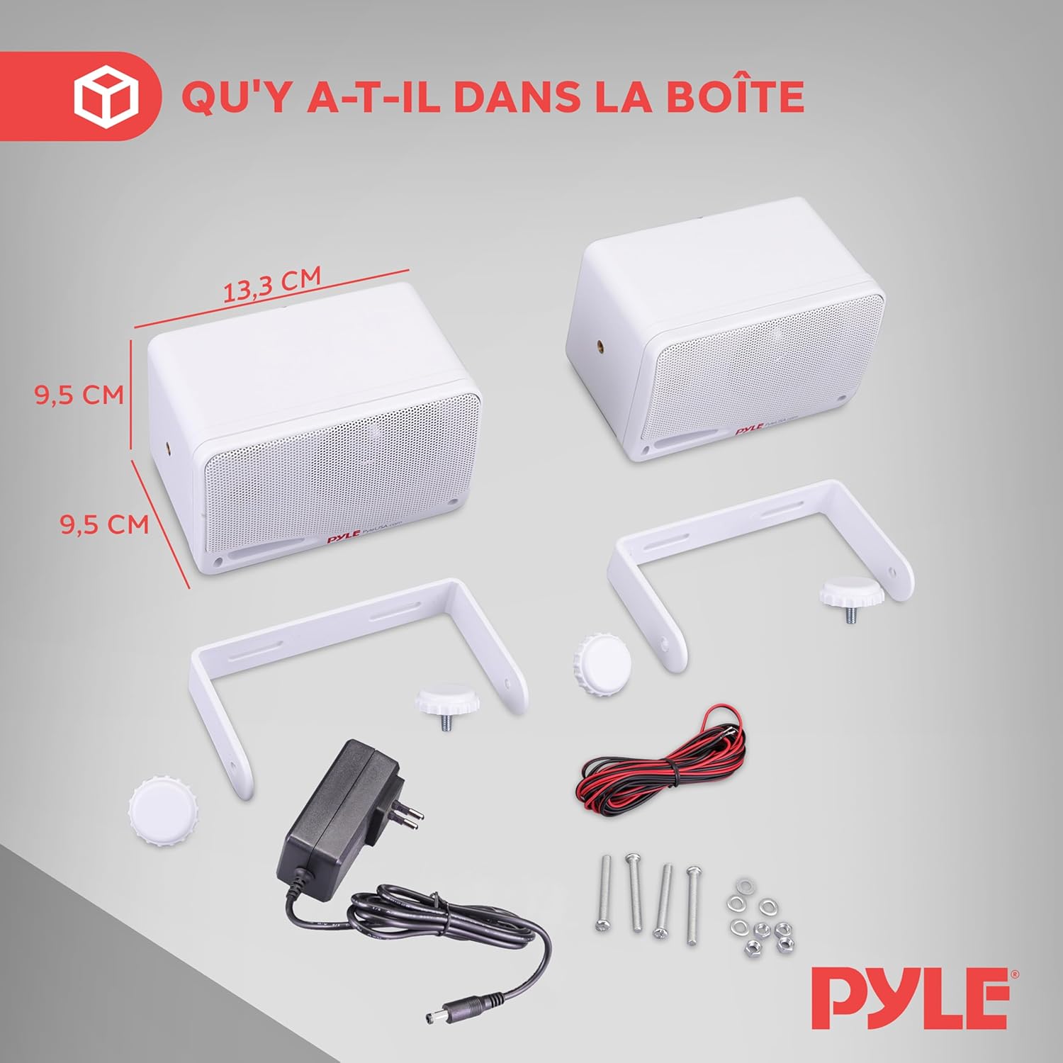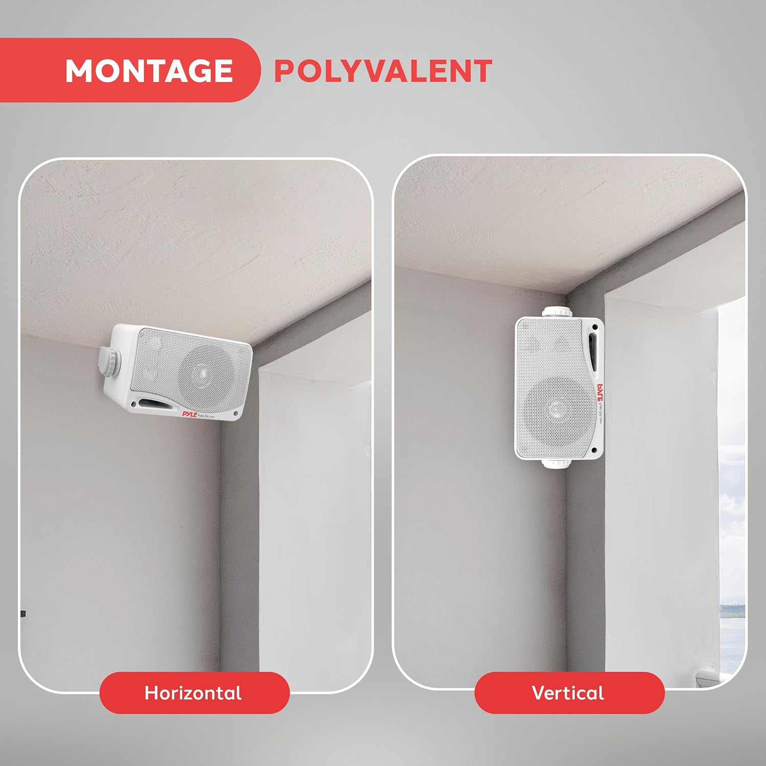 MONTAGE UNIVERSEL : La paire d’enceintes est stockée dans un boîtier de grille robuste antirouille. Conçue pour être montée horizontalement ou verticalement sur un mur, dans un coin ou au plafond. Comprend un support de plaque de montage, un câble d’enceinte de 3,5 mètres et un adaptateur d’alimentation.